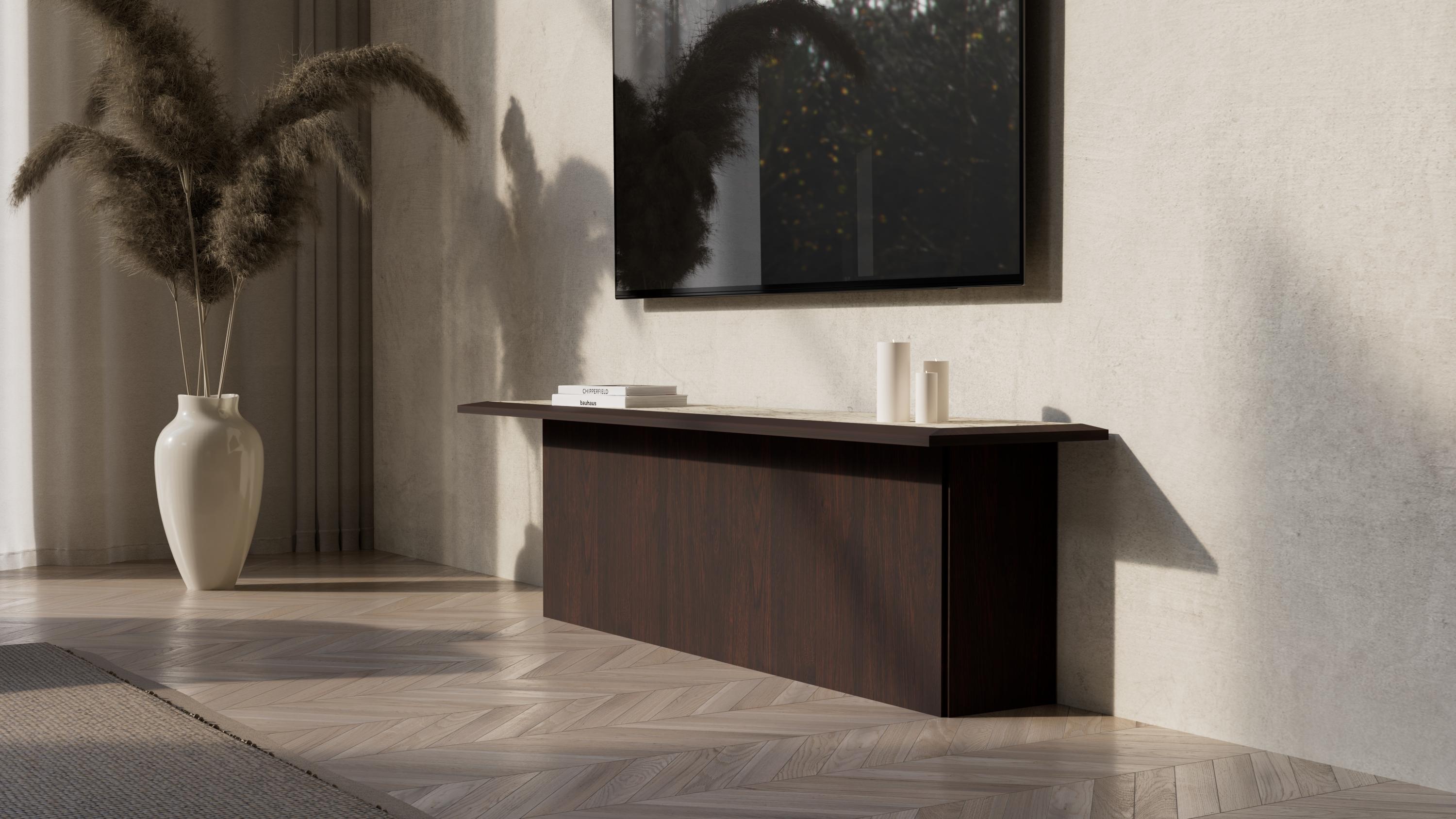 Minimalistyczna forma i eleganckie zestawienie materiałów sprawiają, że szafka RTV staje się wyrazistym elementem nowoczesnego salonu. Głęboki dekor dębu hawana nadaje bryle szlachetnego charakteru, a proste linie podkreślają ponadczasową estetykę mebla. Najbardziej wyjątkowym elementem jest blat wykonany ze spieku kwarcowego. Jego subtelna struktura inspirowana naturalnym kamieniem wprowadza do wnętrza elegancję i poczucie luksusu, jednocześnie zapewniając trwałą i odporną na użytkowanie powierzchnię. Smukła, wydłużona forma doskonale komponuje się z nowoczesnymi telewizorami, tworząc harmonijną i uporządkowaną strefę multimedialną. Szafka idealnie odnajdzie się w aranżacjach modern, japandi czy soft loft, gdzie liczy się wysoka jakość materiałów i dopracowany design.