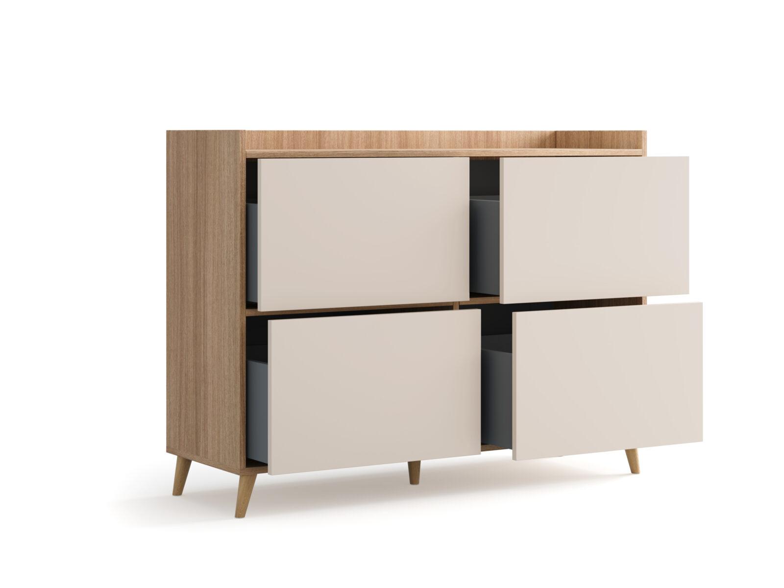 Subtelna forma i harmonijne zestawienie materiałów sprawiają, że komoda Tokyo wprowadza do wnętrza spokój oraz elegancję inspirowaną stylem japandi. Naturalny dekor dębu sławonia w połączeniu z matowymi frontami w odcieniu kaszmiru tworzy ponadczasową kompozycję, która ociepla przestrzeń i nadaje jej lekkości. Cztery pojemne szuflady pozwalają wygodnie uporządkować tekstylia, dokumenty czy drobne akcesoria, zapewniając funkcjonalność na co dzień. Gładkie fronty otwierane w systemie push to open podkreślają minimalistyczny charakter mebla, a smukłe dębowe nóżki dodają bryle wizualnej lekkości. Komoda doskonale sprawdzi się w salonie, sypialni, przedpokoju lub pokoju dziecka – zarówno jako samodzielny mebel, jak i element większej aranżacji z pozostałymi modułami kolekcji Tokyo.
