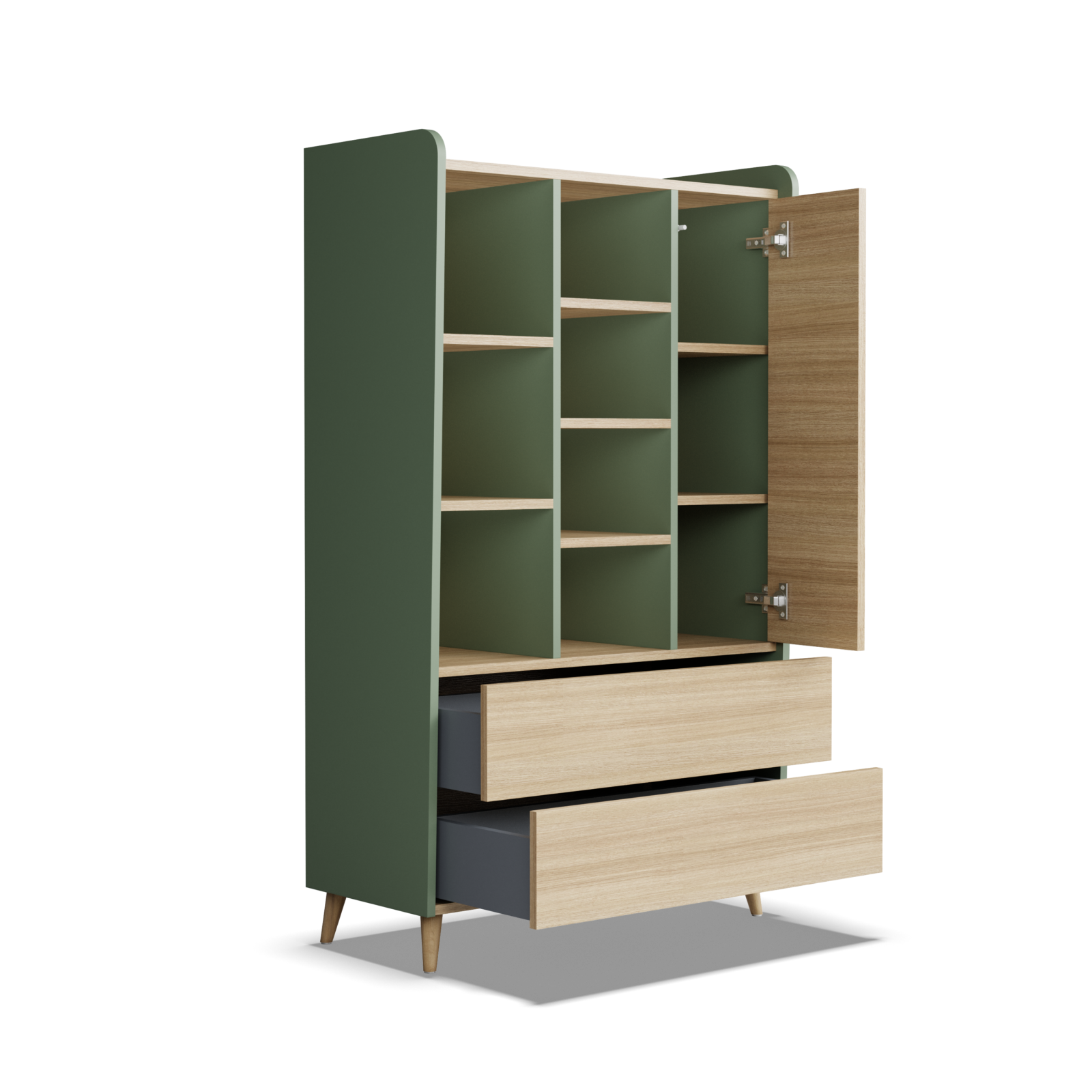 Harmonijne połączenie naturalnego dekoru dębu sławonia z matową oliwkową zielenią tworzy komodę o spokojnym, eleganckim charakterze. Zaokrąglone boki nadają bryle miękkości, a smukłe, drewniane nóżki subtelnie unoszą mebel nad podłogą, wprowadzając lekkość inspirowaną stylem skandynawskim i modern organic. Przemyślany układ przechowywania łączy estetykę z funkcjonalnością. Otwarta część z półkami pozwala wyeksponować książki i dekoracje, natomiast zamykana przestrzeń za drzwiami umożliwia wygodne przechowywanie większych przedmiotów. U dołu znajdują się dwie pojemne szuflady na prowadnicach Blum, które zapewniają płynne i ciche działanie. To mebel zaprojektowany z myślą o wnętrzach, w których liczy się porządek, naturalne materiały i ponadczasowy design.