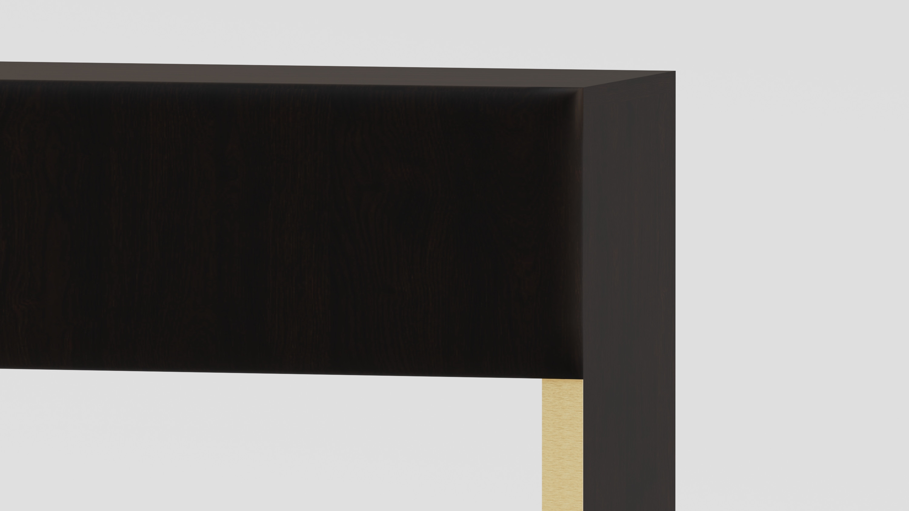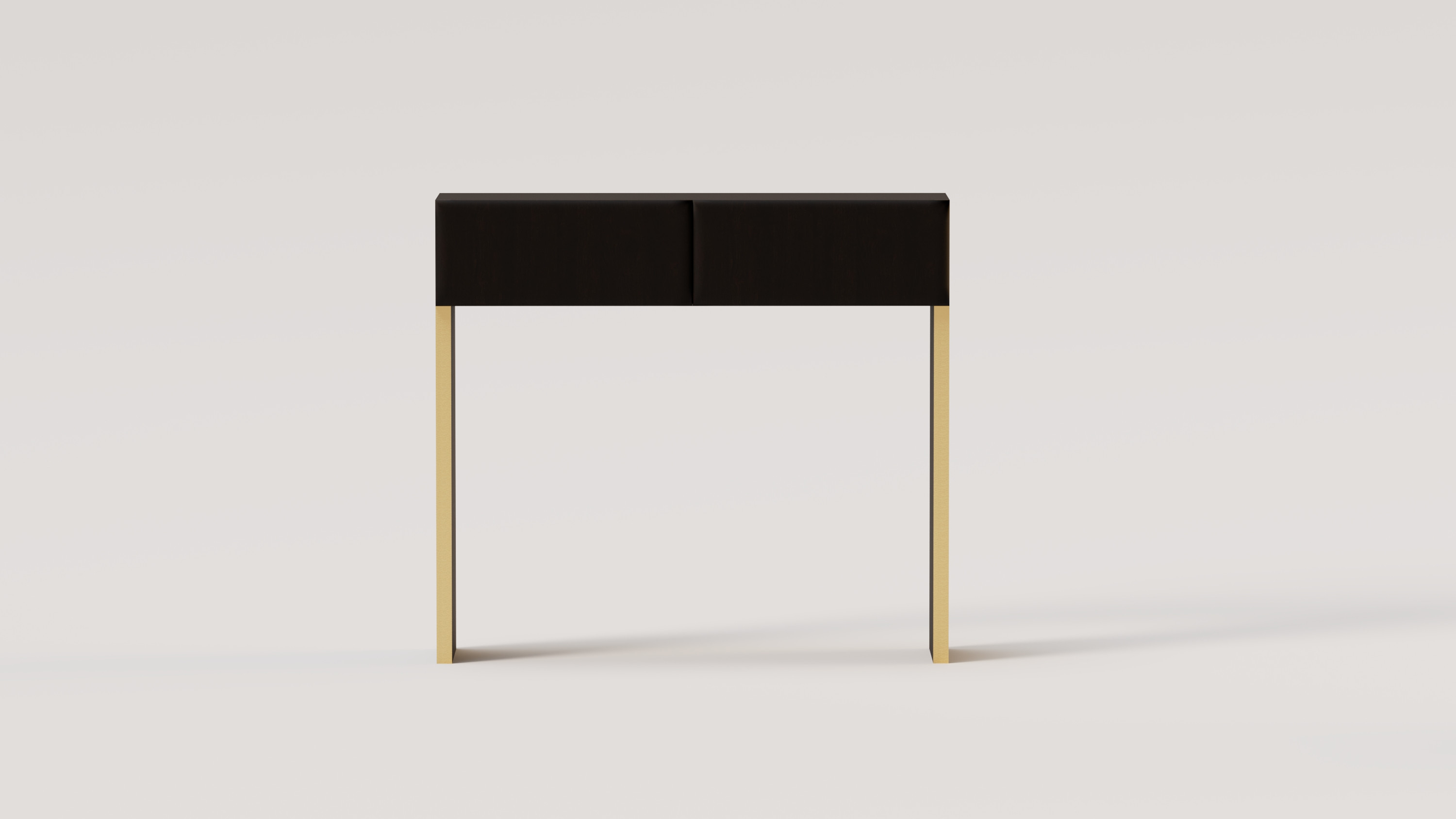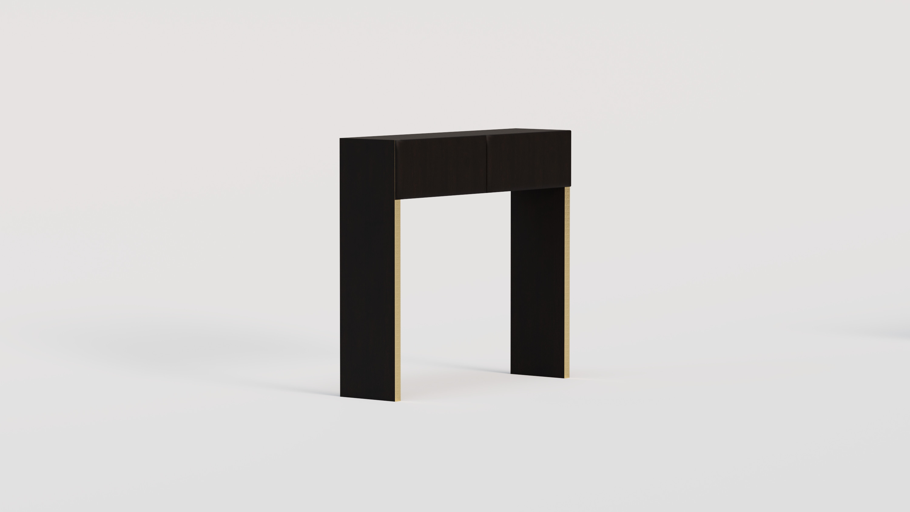 Smukła, minimalistyczna forma w głębokim dekorze dębu hawana tworzy konsolę o eleganckim, wyrafinowanym charakterze. Prosta bryła została przełamana subtelnym akcentem w postaci smukłych nóg w odcieniu szczotkowanego złota, które dodają całości lekkości i wprowadzają do wnętrza nutę luksusu. Dwie dyskretne szuflady pozwalają wygodnie przechowywać drobne przedmioty, dokumenty lub akcesoria, zachowując estetyczny porządek przestrzeni. Smukły blat doskonale sprawdzi się jako miejsce na dekoracje, lampę lub ulubione dodatki. Konsola idealnie odnajdzie się w przedpokoju, salonie, sypialni lub gabinecie, harmonijnie wpisując się w aranżacje modern, glam, japandi dark oraz minimalistyczne wnętrza premium.