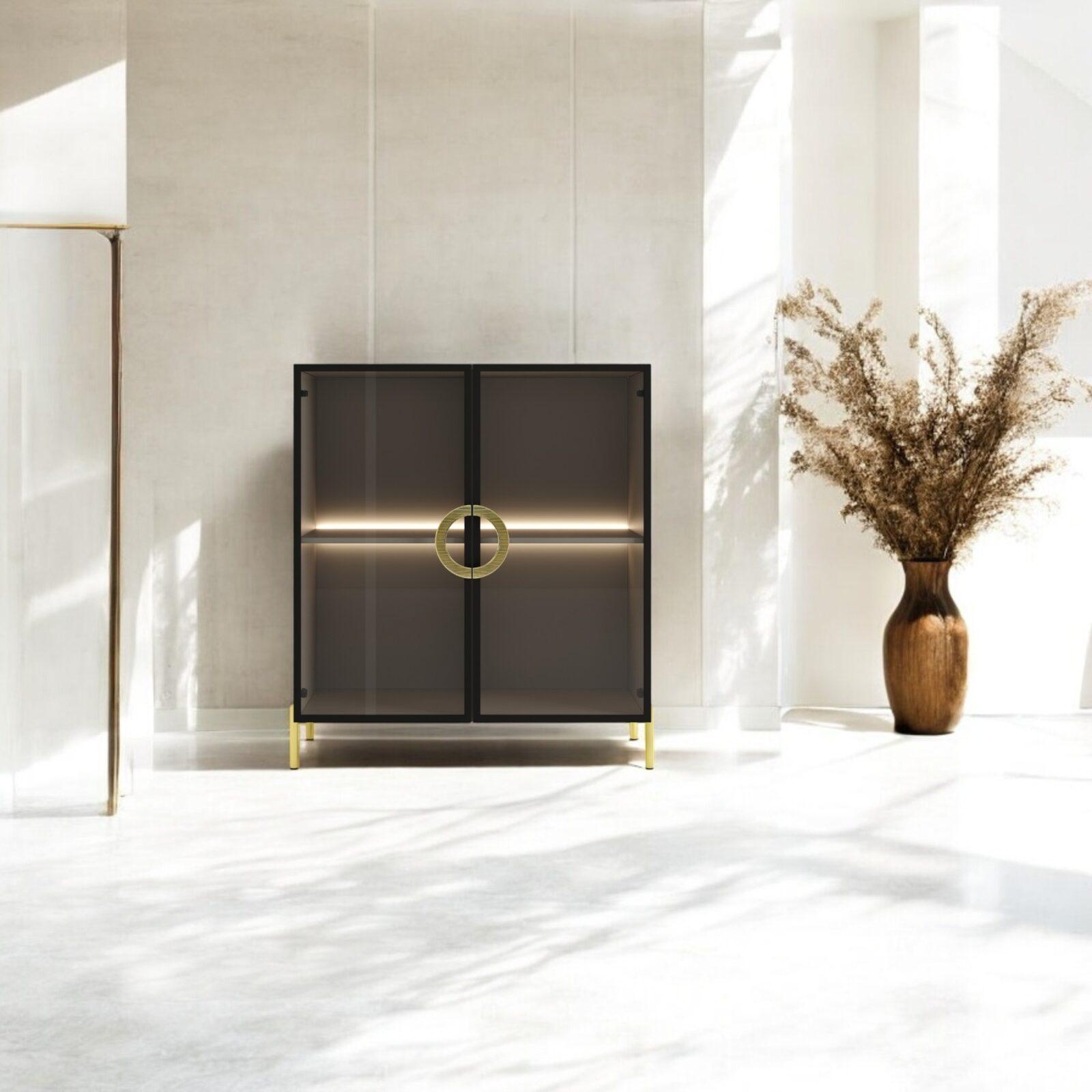 Witryna szklana została zaprojektowana z myślą o wnętrzach premium, w których elegancja spotyka się z funkcjonalnością. Połączenie głębokiej czerni, transparentnych drzwiczek z przyciemnianego szkła oraz subtelnego podświetlenia LED tworzy efekt wyjątkowej lekkości i wyrafinowania — idealny do ekspozycji dekoracji, szkła, porcelany czy kolekcjonerskich przedmiotów. Witryna wykonana jest z płyty laminowanej 18 mm, co zapewnia stabilność i trwałość konstrukcji, a smukłe złote nogi oraz imponujący okrągły uchwyt w odcieniu szczotkowanego złota podkreślają jej biżuteryjny charakter. Przeszklone drzwi zamykane w ramie o czarnym wykończeniu dodają meblowi nowoczesnego, lekko industrialnego akcentu, zachowując przy tym elegancję stylu modern glam. Wewnętrzne oświetlenie LED nadaje wnętrzu mebla głębi i eksponuje jego zawartość w sposób, który odmienia klimat całego pomieszczenia. Witryna świetnie sprawdzi się w salonie, jadalni, gabinecie czy luksusowych przestrzeniach komercyjnych. To mebel, który podnosi prestiż aranżacji i stanowi centralny punkt każdego wnętrza urządzonego ze smakiem i dbałością o detale.